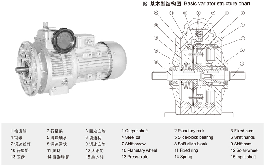 MB無級變速機(jī)基本結(jié)構(gòu)圖有15個方面介紹:1、輸出軸 2、行星架 3、固定凸輪 4、鋼球 5、滑塊軸承 6、調(diào)速柄 7、調(diào)速絲桿 8、調(diào)速滑塊 9、調(diào)速凸輪 10、行星輪 11、定環(huán) 12、太陽輪 13、壓盤 14、碟形彈簧 15、輸入軸